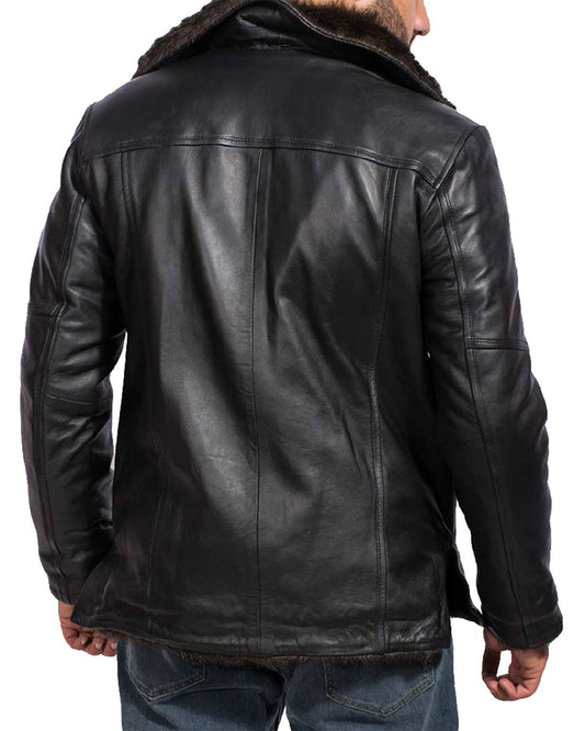 Men's Parka Leather Jacket Black | Detachable Fur On Hood