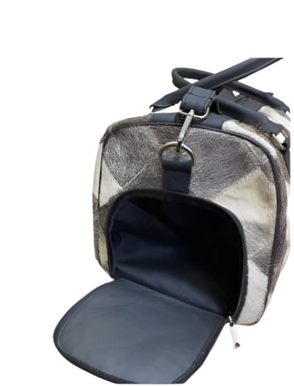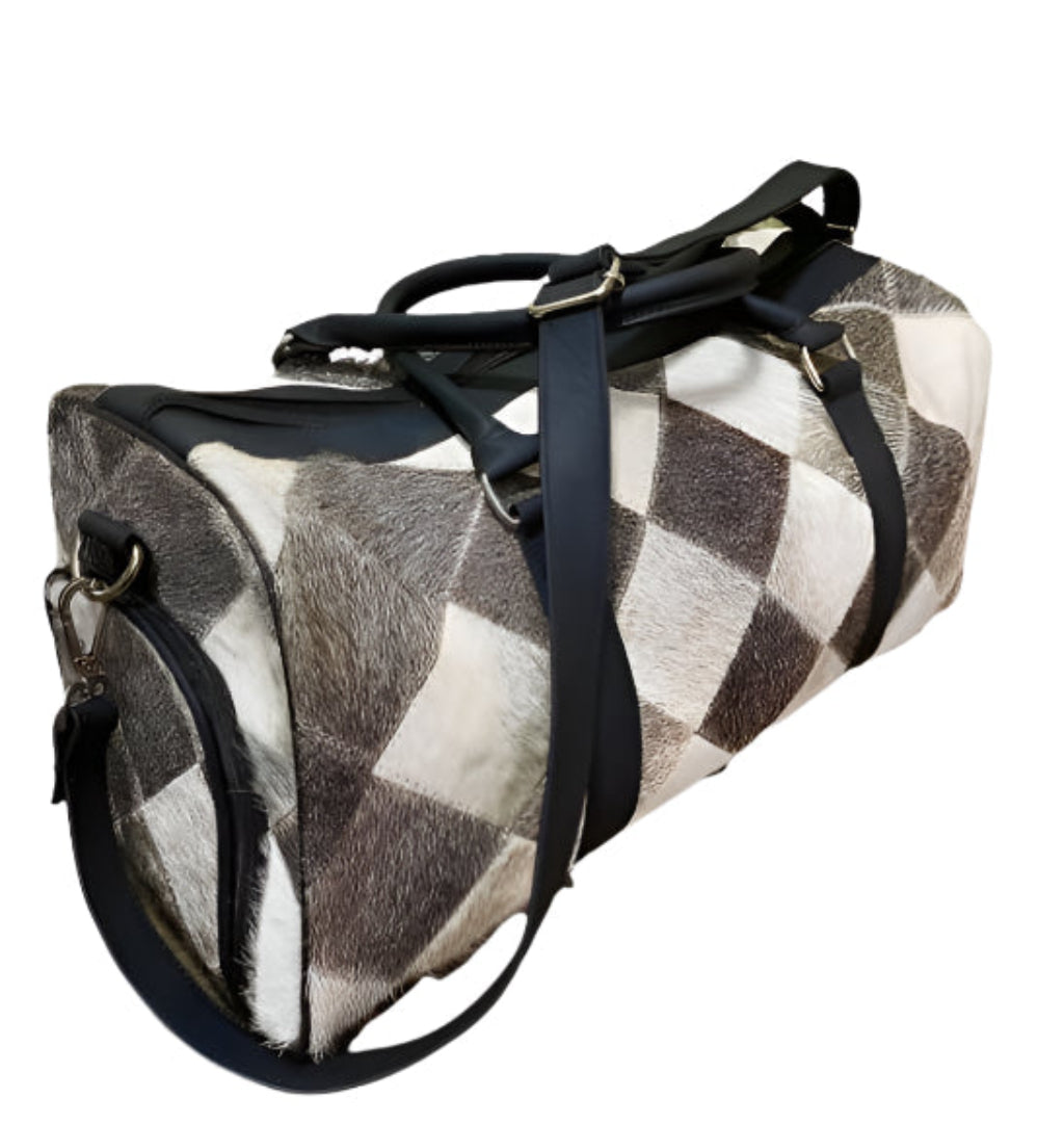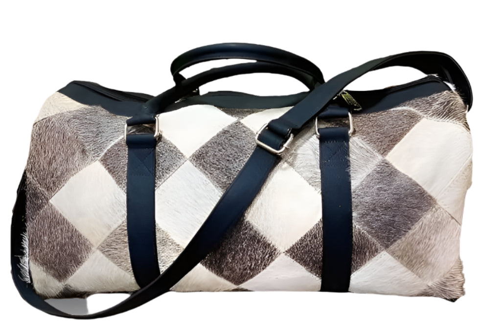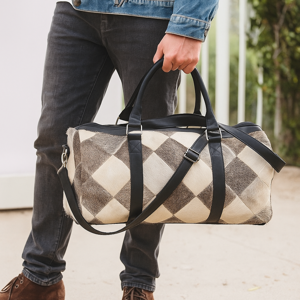 Unleash your adventurous spirit with "The Artisan Patchwork" travel duffel, a truly distinctive travel bag that promises to turn heads. Each bag is a masterpiece, meticulously crafted from hand-sorted cowhide patches in a captivating diamond pattern of rich grey and white. This isn't just a bag; it's a wearable piece of art, ensuring your journey is as unique as you are.