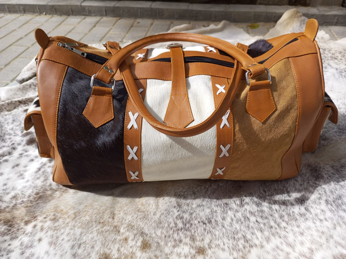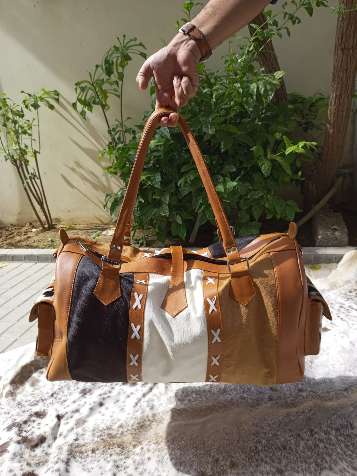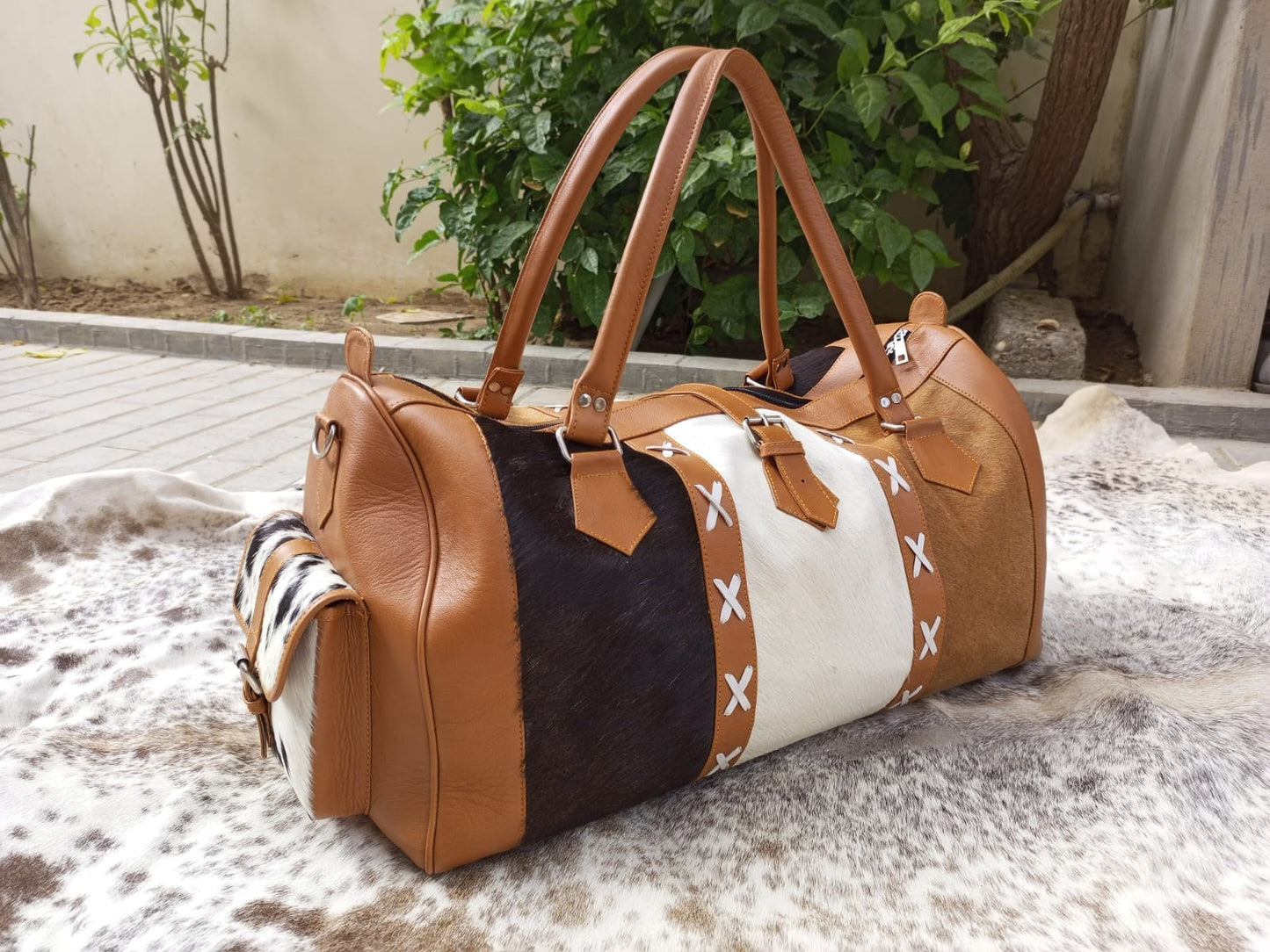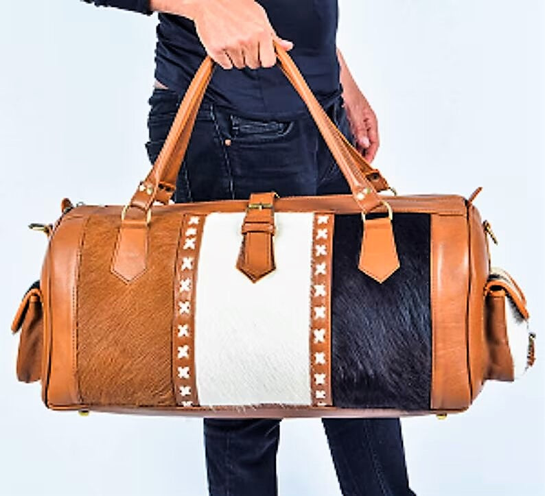 Experience the luxury of our unique real cowhide duffle bag Best travel bag for your next trip . Crafted from solid color real cowhides, this duffle bag is built to last, while its tricolor design adds a stylish touch to your look.