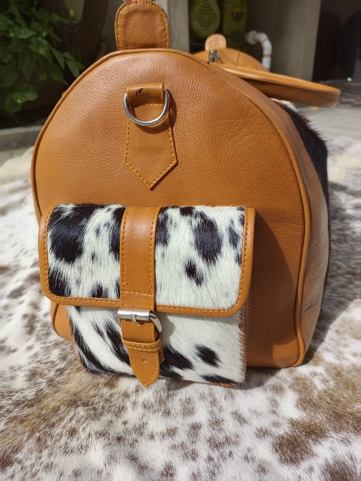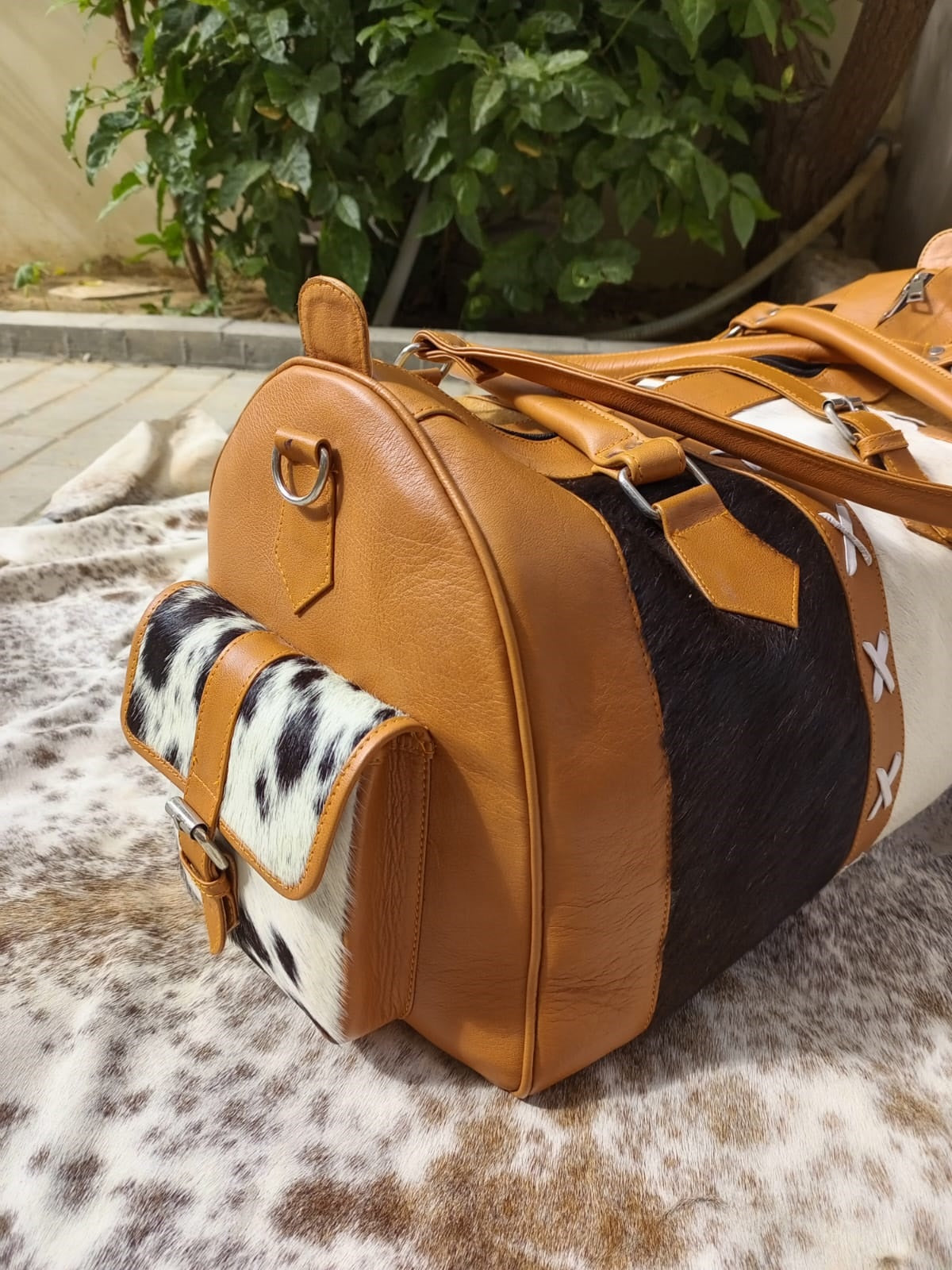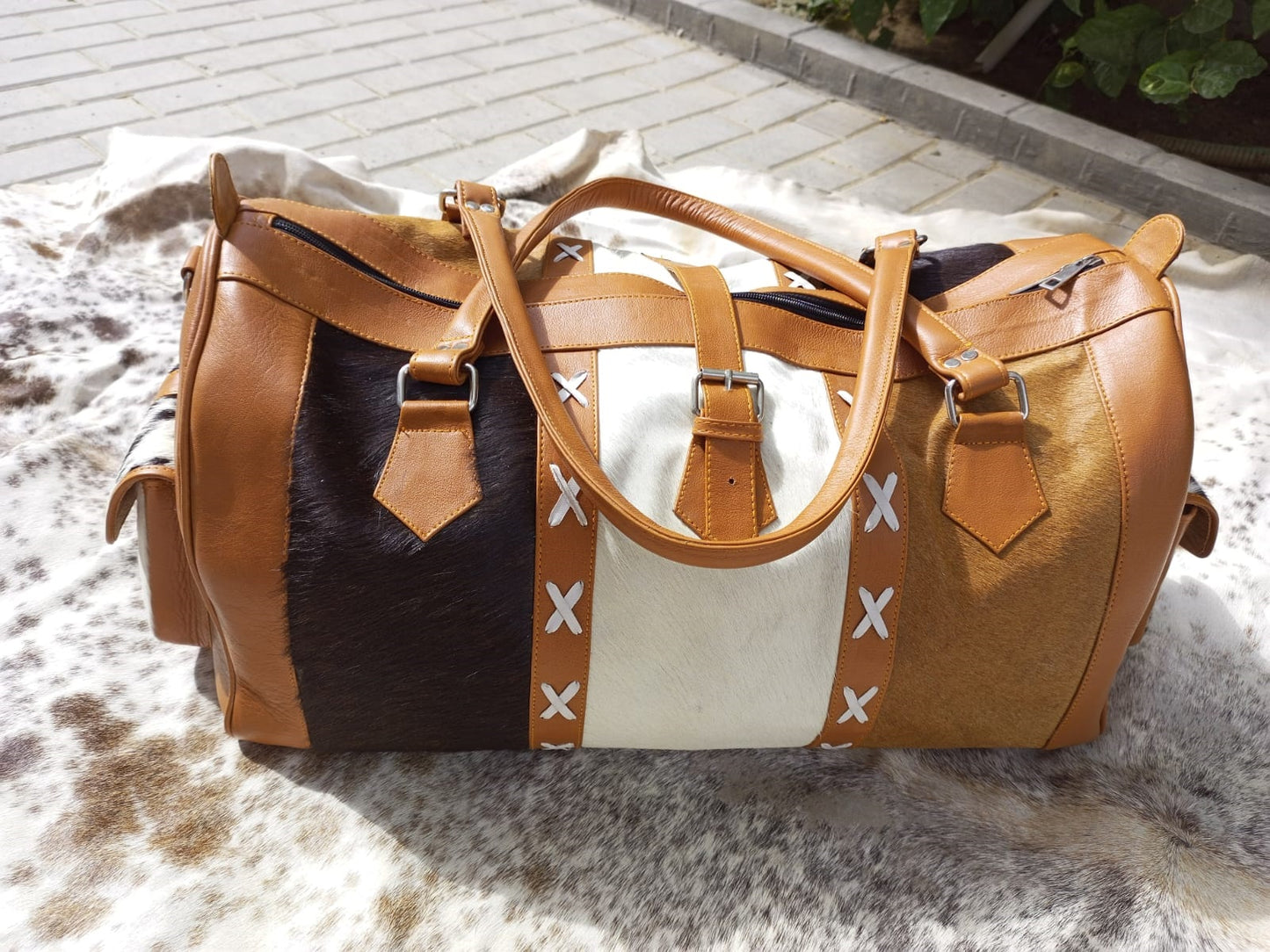 Experience the luxury of our unique real cowhide duffle bag Best travel bag for your next trip . Crafted from solid color real cowhides, this duffle bag is built to last, while its tricolor design adds a stylish touch to your look.